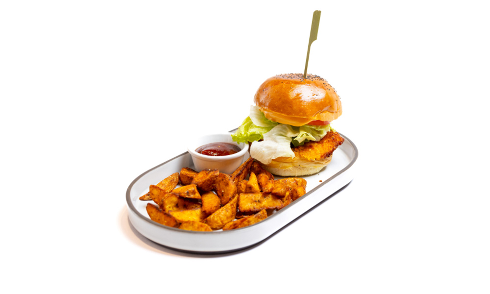 breaded chicken fillet, parmesan cream, and tomato. Accompanied by French fries.
