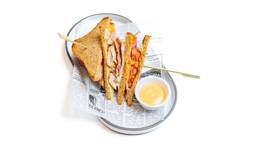 Chicken, cheddar, lettuce, tomato, bacon and mayonnaise. Served with fries and a green salad.