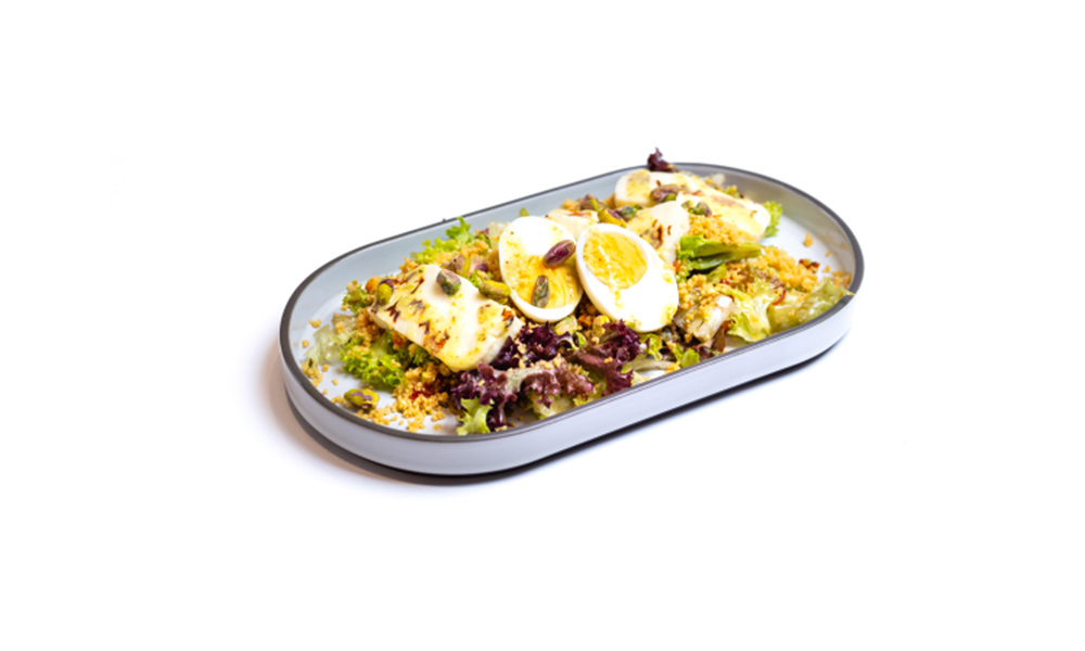 αυγό βραστό, χαλούμι & σως με φυστίκι Αιγίνης