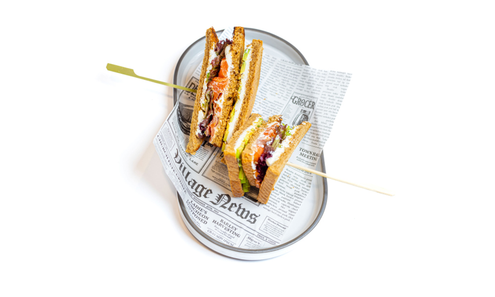 (ψωμί ολικής) καπνιστό σολομό, τυρί κρέμα, ντομάτα, spread αβοκάντο & πράσινη σαλάτα Συνοδεύεται από τηγανητές πατάτες